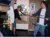 My old roommate, Len, and I are playing hockey in our dorm room. We both are die hard hockey fans and players.